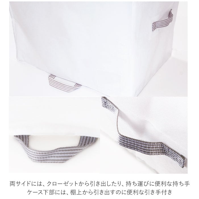 ・両サイドにはクローゼットから引き出したり持ち運びに便利な持ち手と、ケース下部には棚上から引き出すのに便利な引き手付き。
