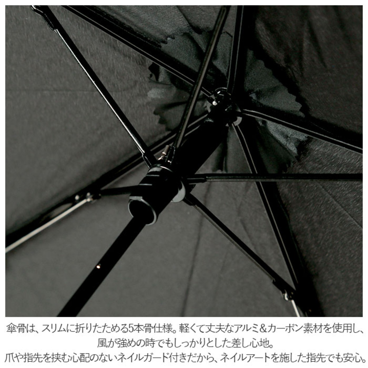 ・傘骨は、スリムに折りたためる5本骨仕様。軽くて丈夫なアルミ&カーボン素材を使用し、風が強めの時でもしっかりとした差し心地。