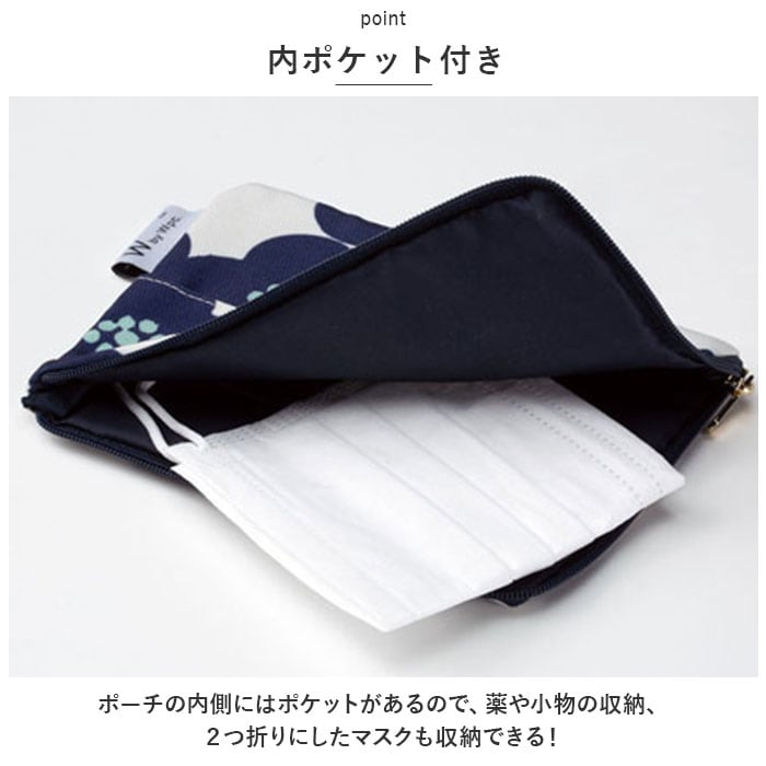 ・ポーチの内側にはポケットがあるので、薬や小物の収納、2つ折りにしたマスクも収納できる!