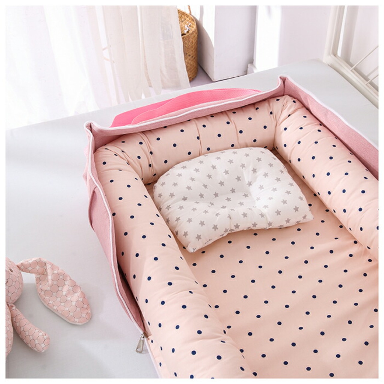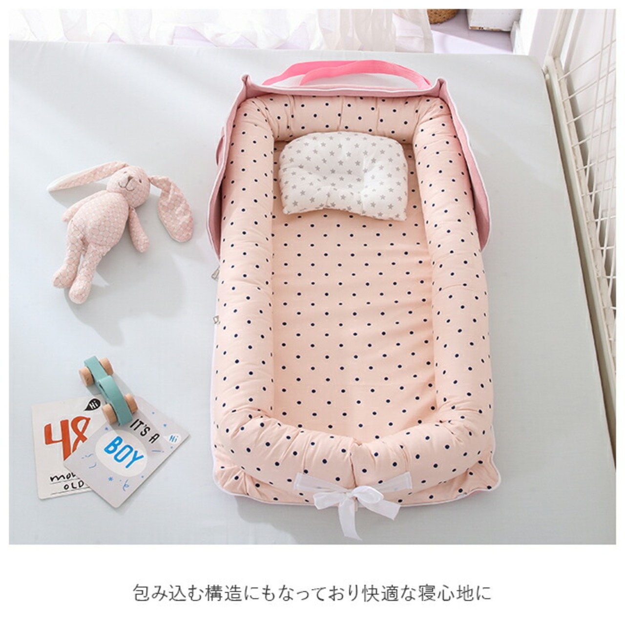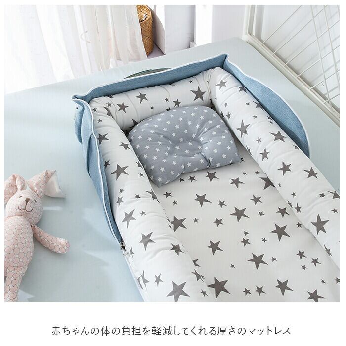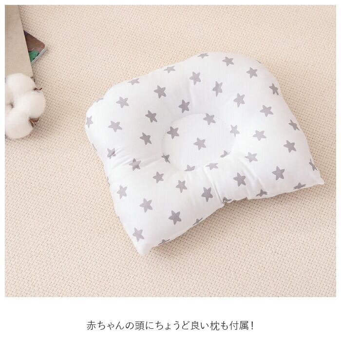 ・赤ちゃんの体の負担を軽減してくれる厚さのマットレス。包み込む構造にもなっており快適な寝心地に。赤ちゃんの頭にちょうど良い枕も付属!