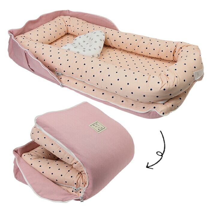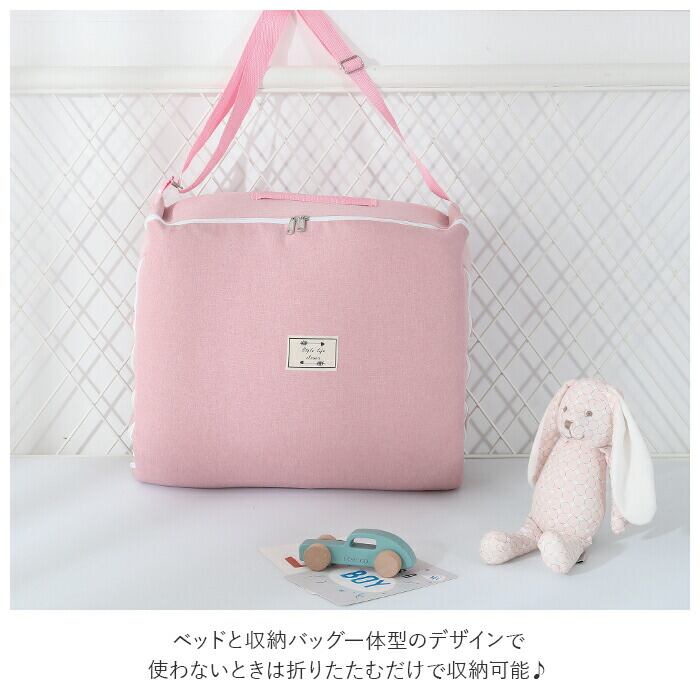 ・ベッドと収納バッグ一体型のデザインで使わないときは折りたたむだけで収納可能♪収納バッグのサイドには小物を入れるのに便利なオープンポケット×2付き。