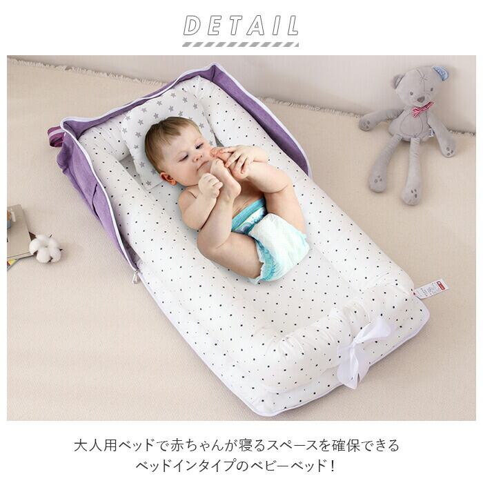 ・大人用ベッドで赤ちゃんが寝るスペースを確保できるベッドインタイプのベビーベッド!パパやママの寝返りでぶつかったり、ベッドからの落下防止に役立つ。