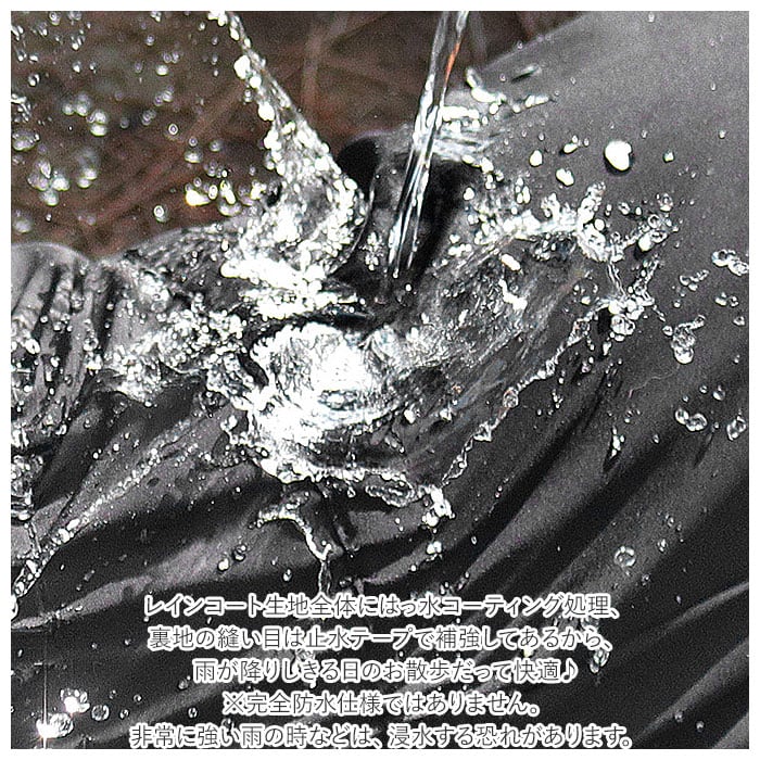・レインコート生地全体にはっ水コーティング処理、裏地の縫い目は止水テープで補強してあるから、雨が降りしきる日のお散歩だって快適♪(※完全防水仕様ではありません。非常に強い雨の時などは、浸水する恐れがあります。)