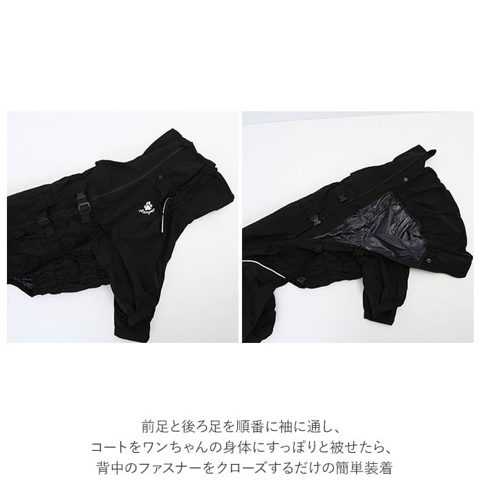 ・前足と後ろ足を順番に袖に通し、コートをワンちゃんの身体にすっぽりと被せたら、背中のファスナーをクローズするだけの簡単装着。