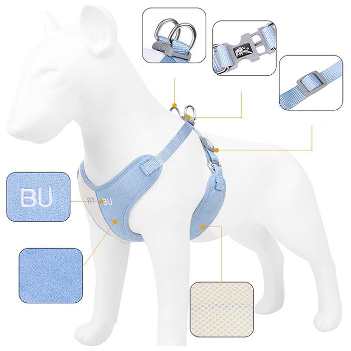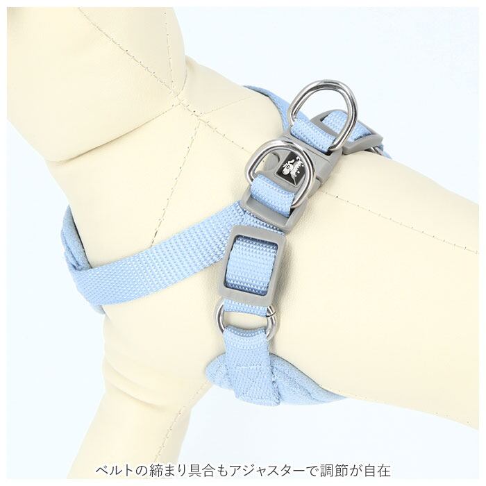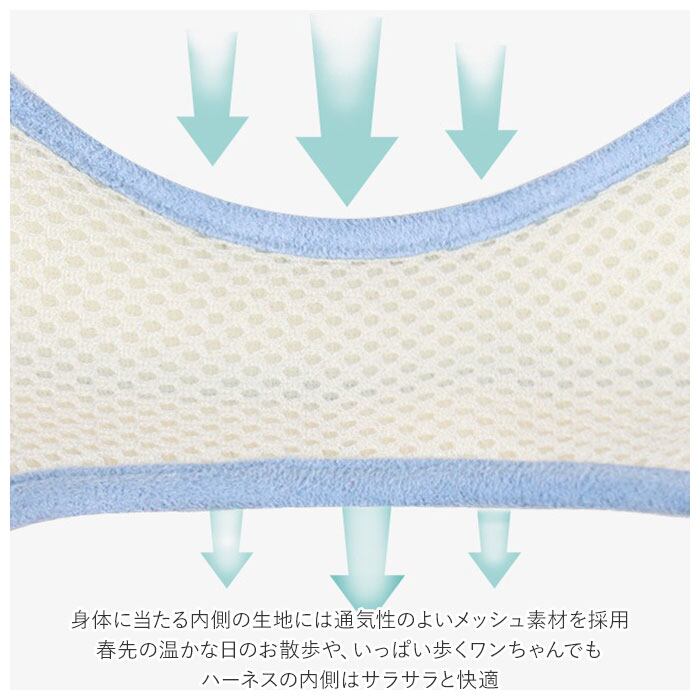 ・身体に当たる内側の生地には通気性のよいメッシュ素材を採用。春先の温かな日のお散歩や、いっぱい歩くワンちゃんでもハーネスの内側はサラサラと快適。