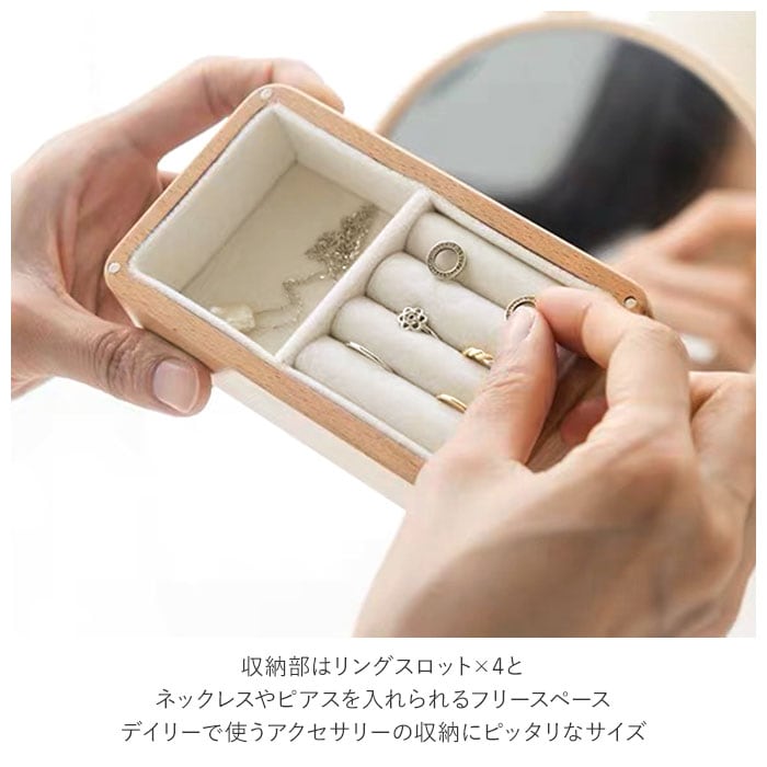 ・収納部はリングスロット×4とネックレスやピアスを入れられるフリースペース。デイリーで使うアクセサリーの収納にピッタリなサイズ。