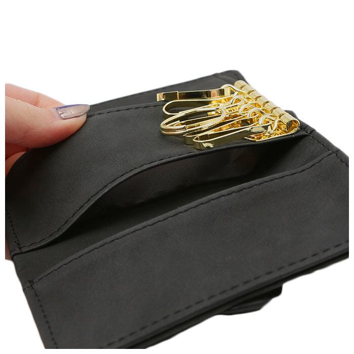 ・フラップを開くと中央にはキーフック×5、リング型フック×1が配置されており、自宅や自転車など複数の鍵をまとめておける。
