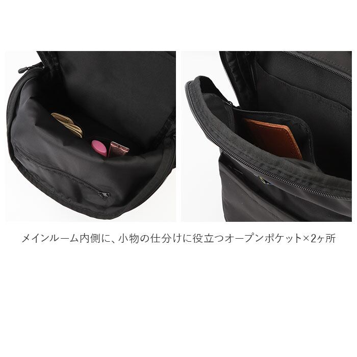 ・メインルーム内側に、小物の仕分けに役立つオープンポケット×2ヶ所に、背面側をクッション素材で仕上げたタブレットポケットも搭載。(※11inch以下のタブレットに対応。)
