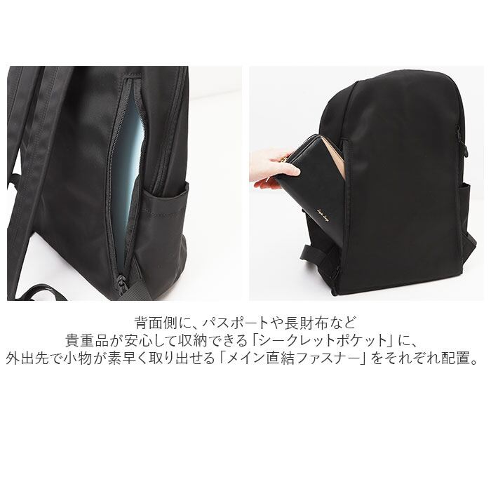 ・バックパック背面側に、パスポートや長財布など貴重品が安心して収納できる「シークレットポケット」に、外出先で小物が素早く取り出せる「メイン直結ファスナー」をそれぞれ配置。