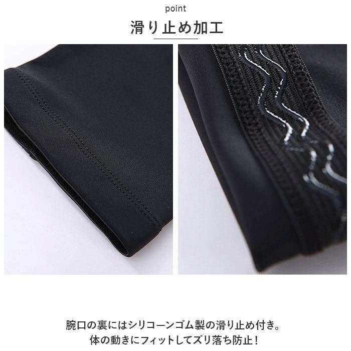 ・腕口の裏にはシリコーンゴム製の滑り止め付き。体の動きにフィットしてズリ落ち防止!