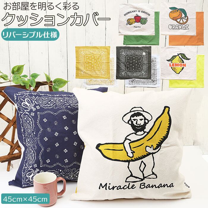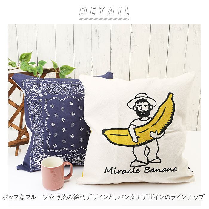 ・ポップなフルーツや野菜の絵柄デザインと、バンダナデザインのラインナップ。クッションカバーを変えるだけで気軽にお部屋の模様替えを楽しめちゃう!