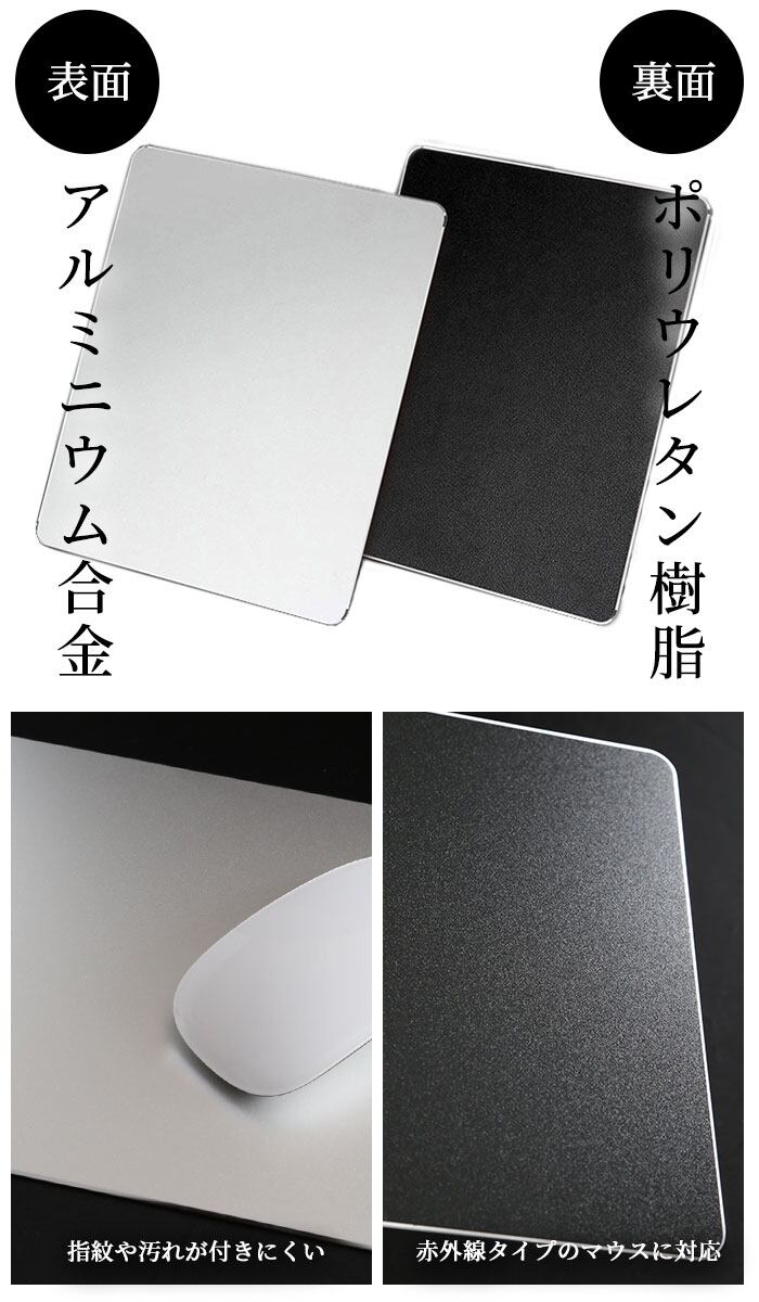 ・表面はアルミニウム合金で裏面はPU(ポリウレタン樹脂)素材。どちらでもお使いいただけるリバーシブル仕様。(※赤外線タイプのマウスは裏面のみご使用可能です。)