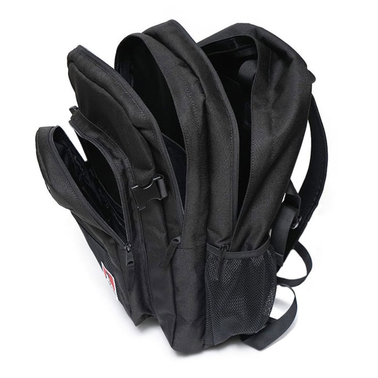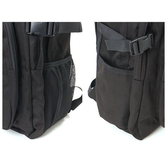 ・右サイドにメッシュ素材のオープンポケット、左サイドにオープンポケット付き。ペットボトルや折りたたみ傘の収納に便利。