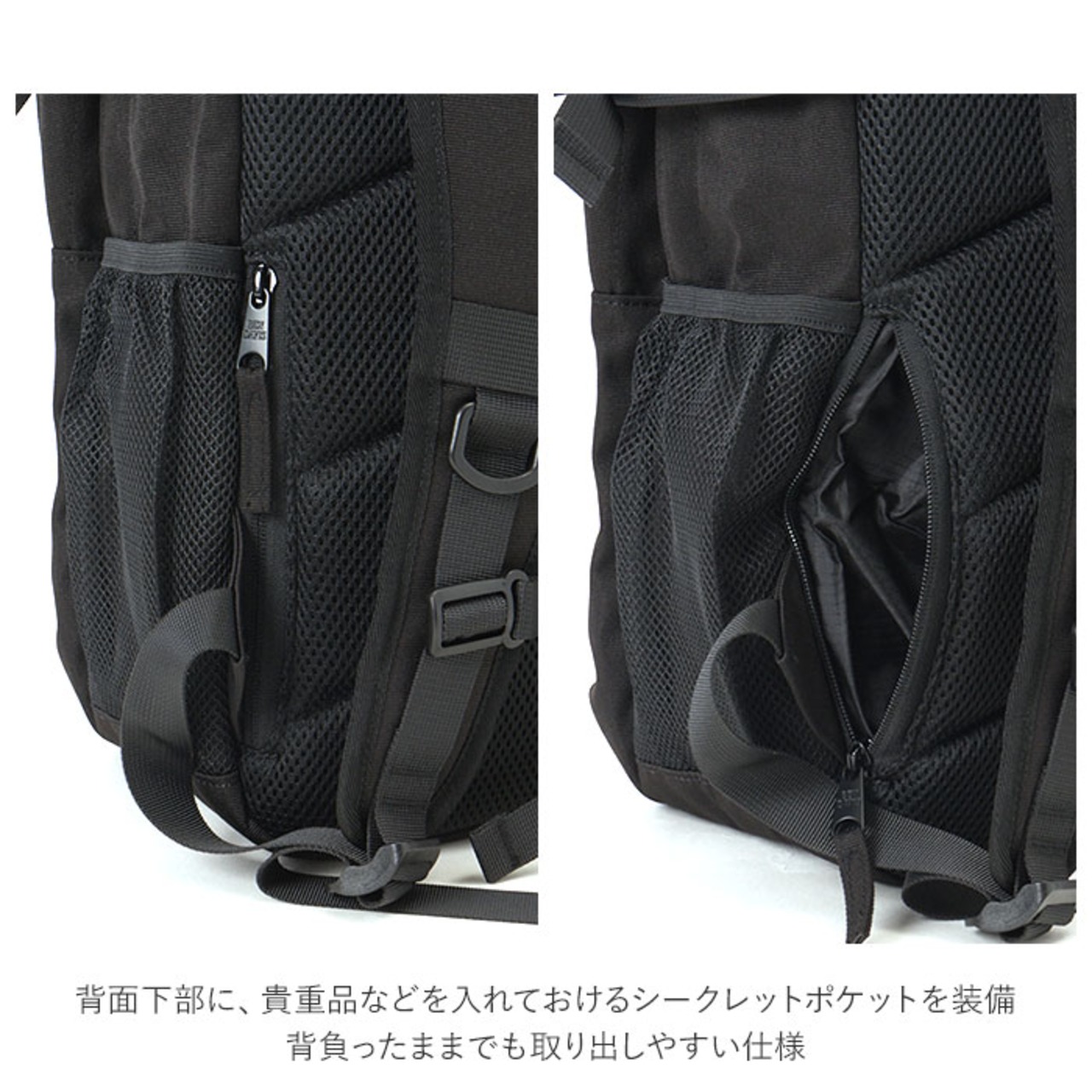 ・背面下部に、貴重品などを入れておけるシークレットポケットを装備。背負ったままでも取り出しやすい仕様。