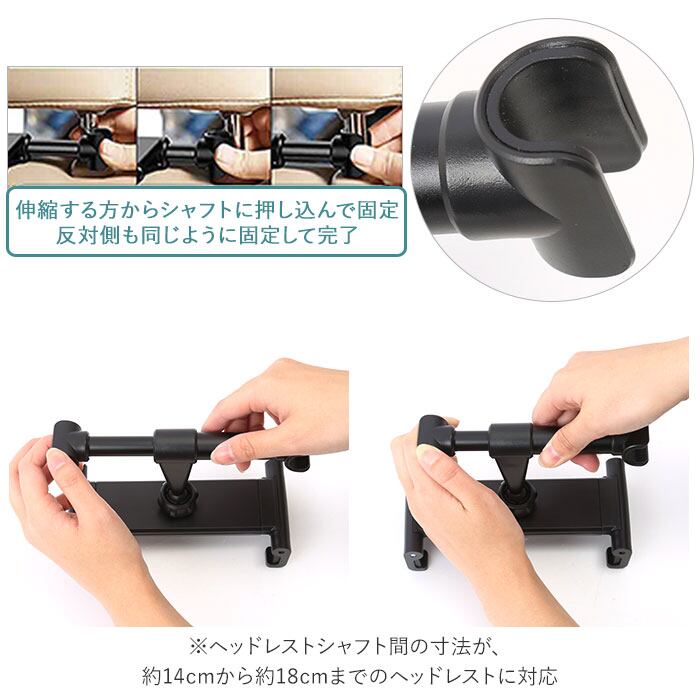 ・ヘッドレストステーの2本のシャフトの間に、片側が伸縮するポールを取り付けるだけで設置が簡単!(※ヘッドレストシャフト間の寸法が約14cmから約18cmまでのヘッドレストに対応。)