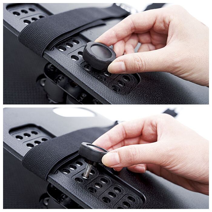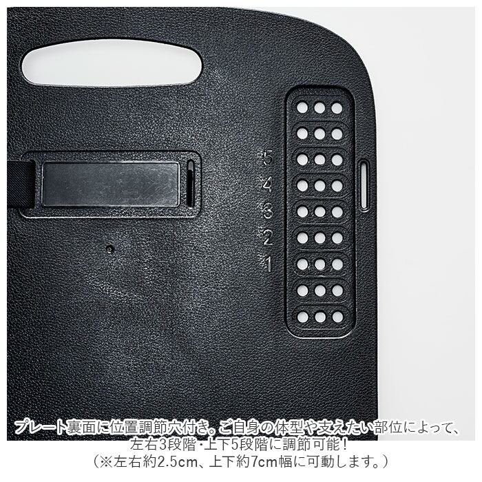 ・プレート裏面に位置調節穴付き。ご自身の体型や支えたい部位によって、左右3段階・上下5段階に調節可能!(※左右約2.5cm、上下約7cm幅に可動します。)