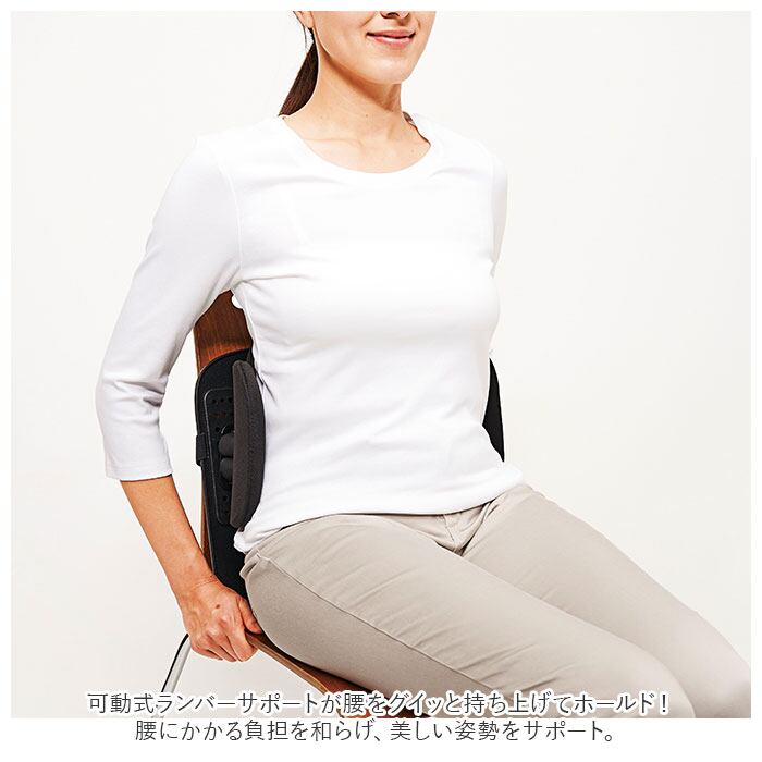 ・可動式ランバーサポートが腰をグイッと持ち上げてホールド!腰にかかる負担を和らげ、美しい姿勢をサポート。