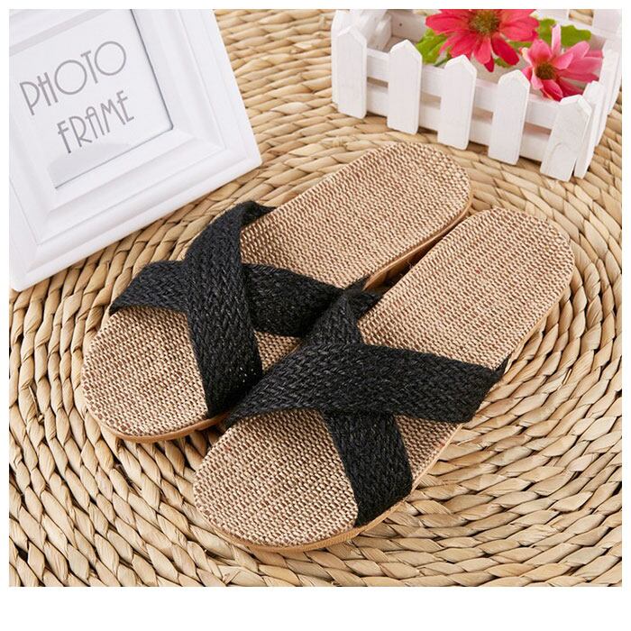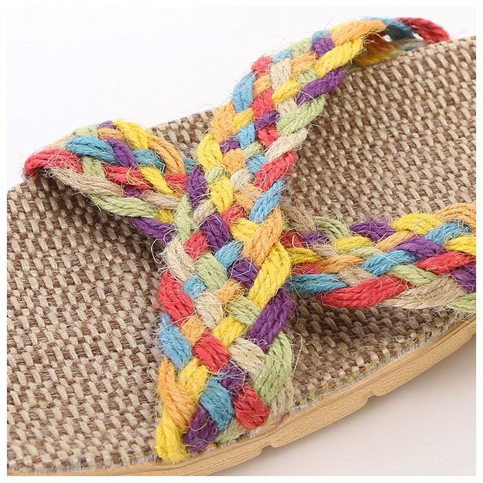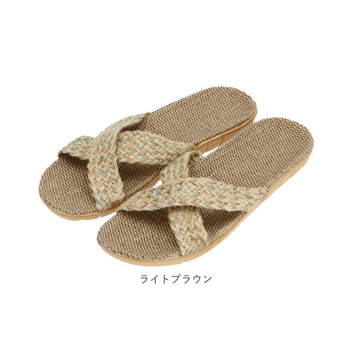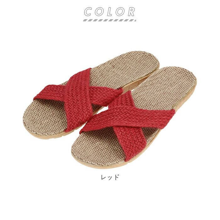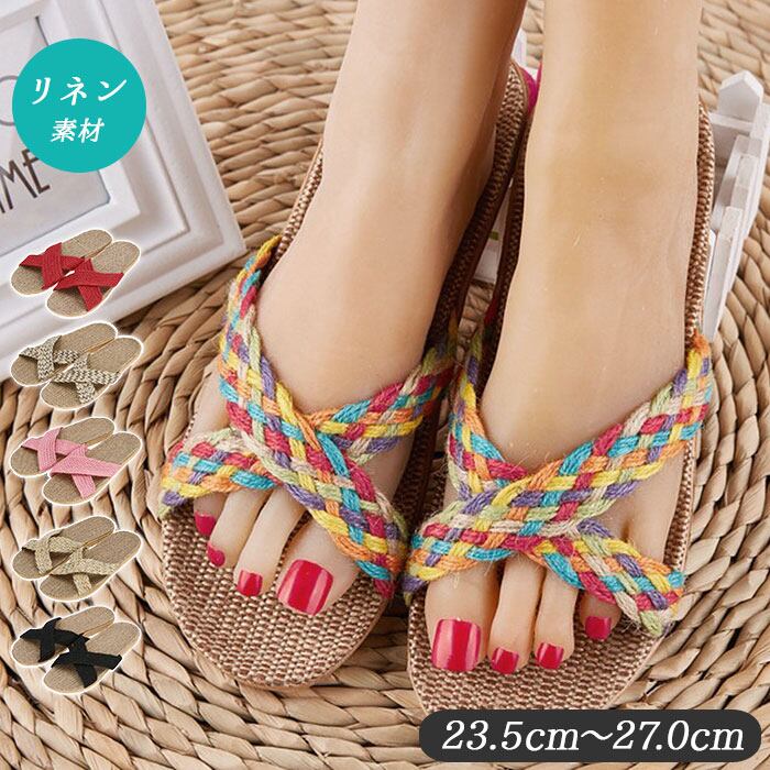 ・足の甲を覆うクロスベルトが印象的な、リネン素材のフラットスリッパ。