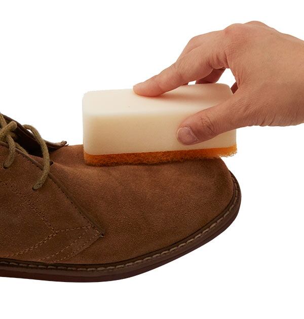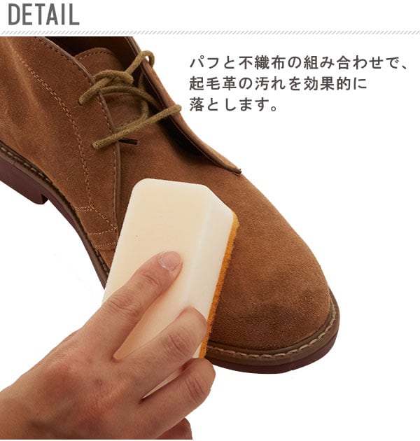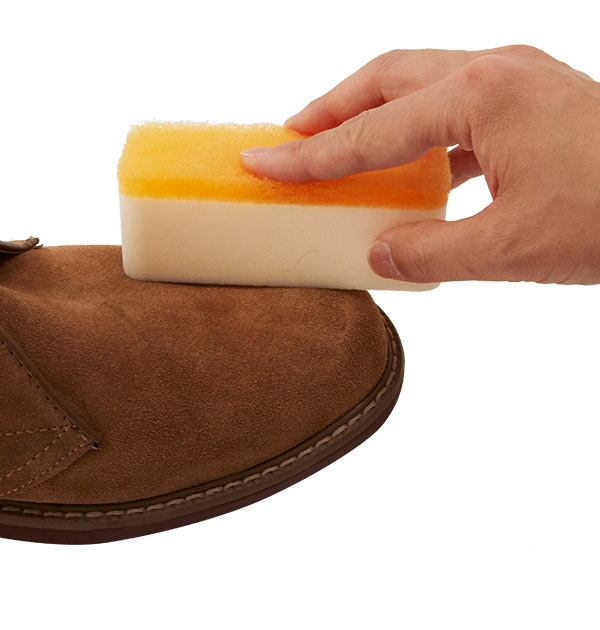 スエード、起毛革用お手入れスポンジ。バフと不織布の組み合わせで起毛革の汚れを効果的に落とします。