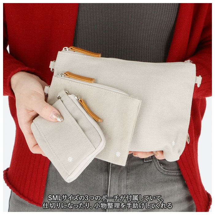 ・SMLサイズの3つのポーチが付属していて、仕切りになったり、小物整理を手助けしてくれる。