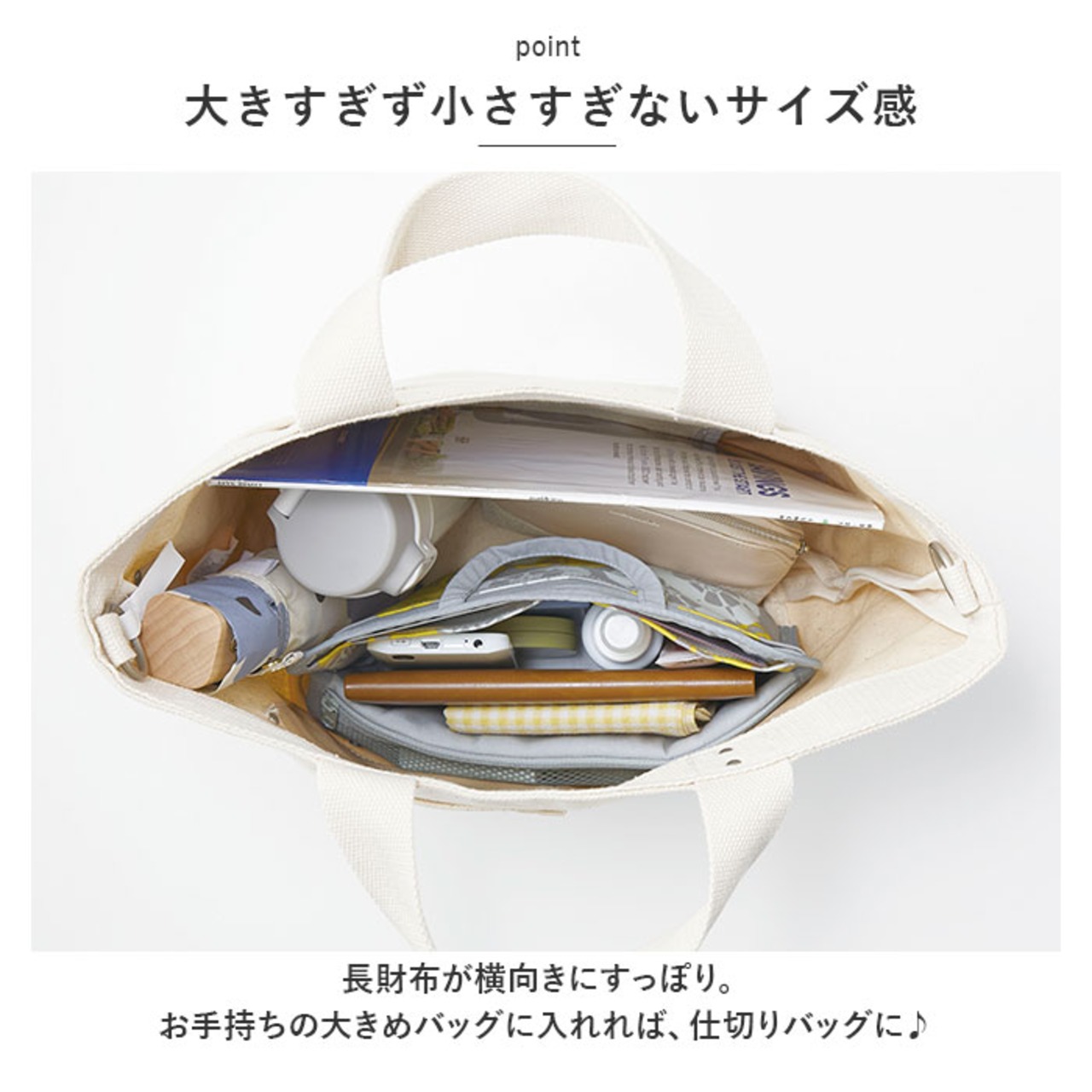 ・長財布が横向きにすっぽり。お手持ちの大きめバッグに入れれば、仕切りバッグに♪