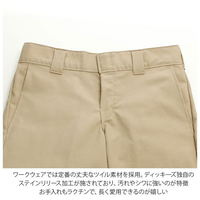 ・コットン35%・ポリエステル65%。ワークウェアでは定番の丈夫なツイル素材を採用。ディッキーズ独自のステインリリース加工が施されており、汚れやシワに強いのが特徴。アイロンやお洗濯などお手入れもラクチンで、長く愛用できるのが嬉しい。
