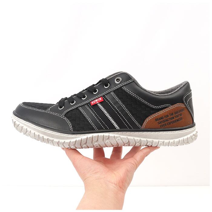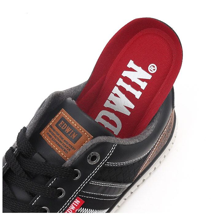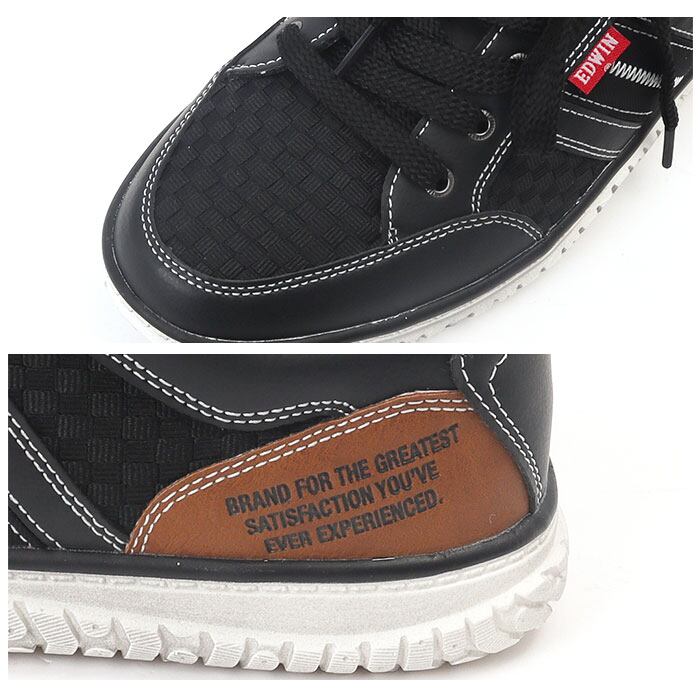 ・シックなフェイクレザーを貼り分けたアッパーに、編み込み生地と「EDWIN」のレザータグで個性が際立つデザイン。大人カジュアルな服装やジーンズスタイルの素敵なワンポイントに。