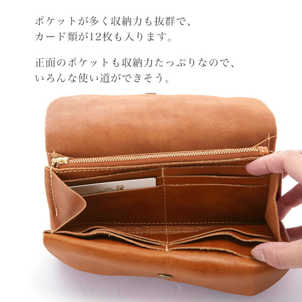 ・内側:ファスナー付小銭入れ×1 ボタン付小銭入×1 お札入れ×2 カード入れ×12枚