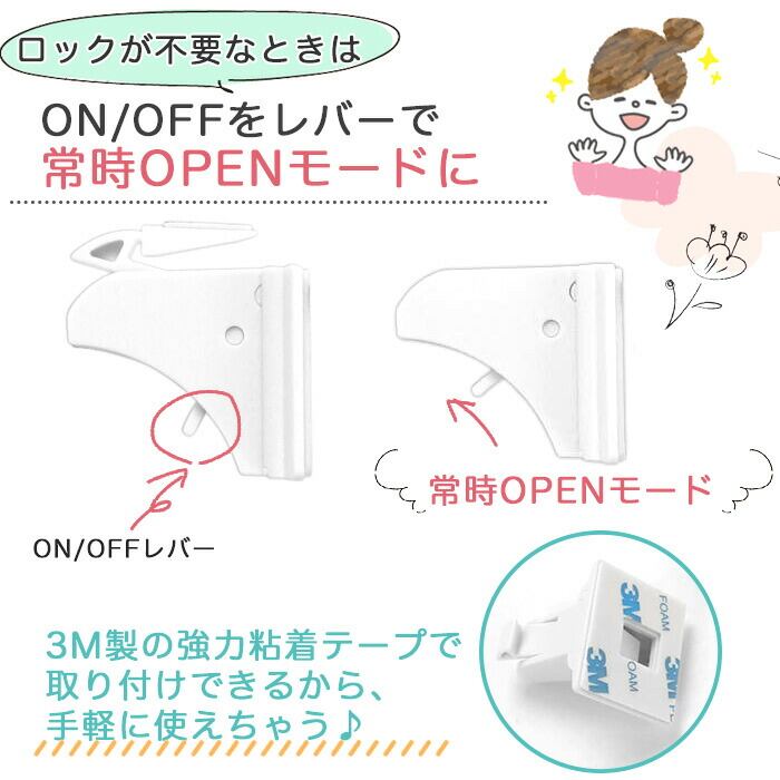 ・ロックが不要なときは、ON/OFFをレバーを上げることで常時OPENモードに。レバーを下げるとマグネットキーでの開閉が可能な状態に。
