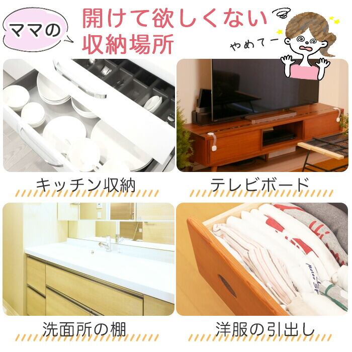 ・刃物や誤飲の危険がある洗剤。それらを収納している棚の扉や引き出しを、簡単にロックできる便利アイテム。