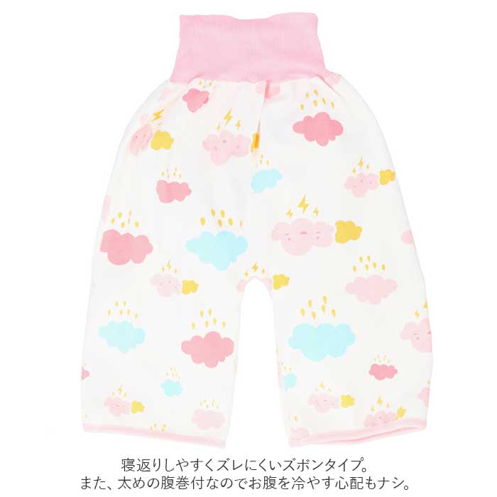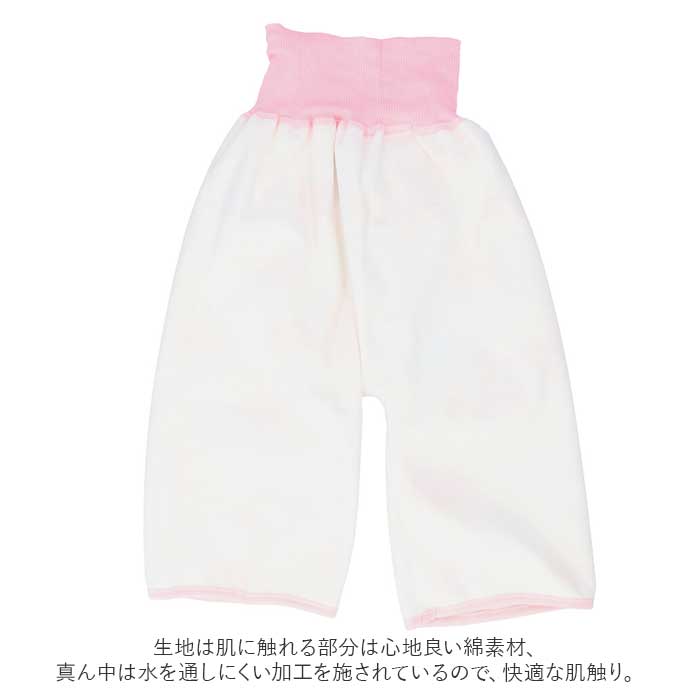 ・寝返りしやすくズレにくいズボンタイプ。裾が捲れにくく、寝返りしても漏れにくい仕様。また、太めの腹巻付なのでお腹を冷やす心配もナシ。
