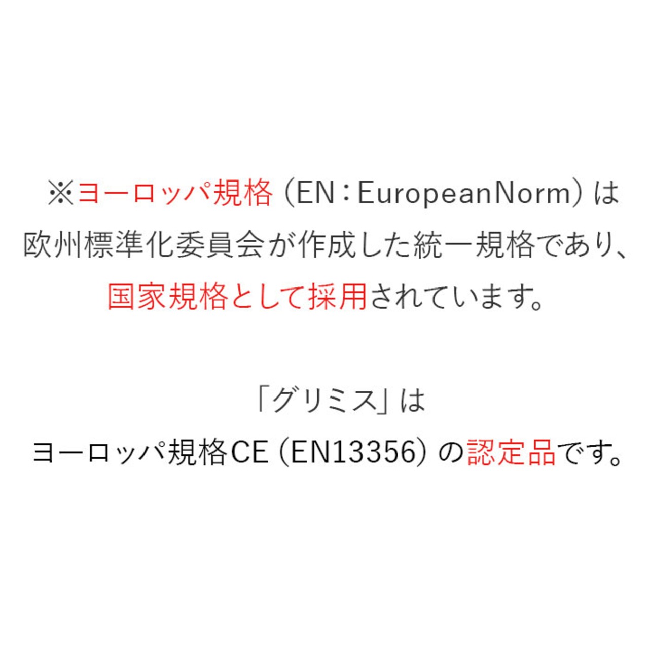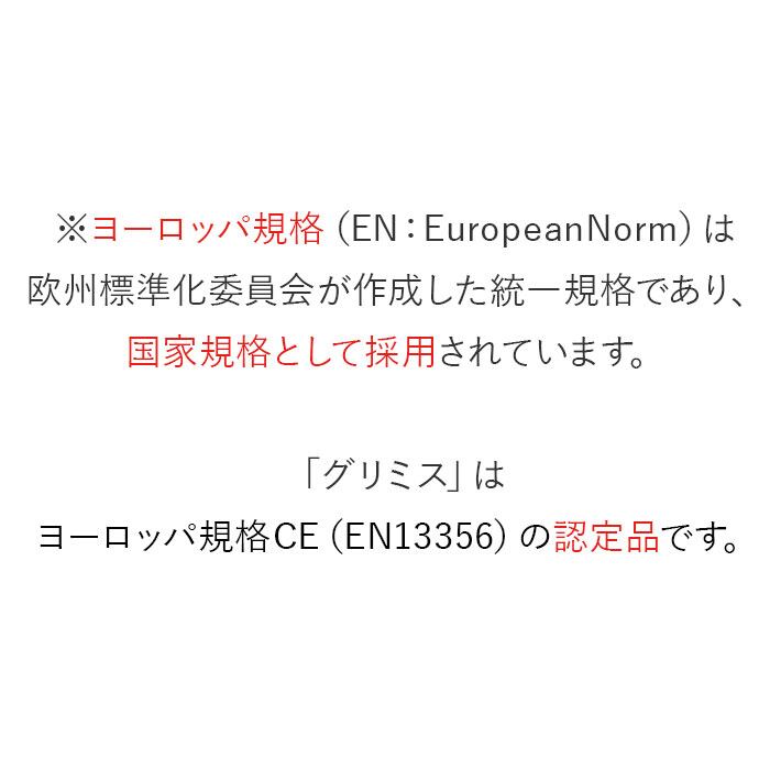 ・※ヨーロッパ規格(EN:EuropeanNorm)は、欧州標準化委員会が作成した統一規格であり、国家規格として採用されています。「グリミス」は、ヨーロッパ規格CE(EN13356)の認定品です。
