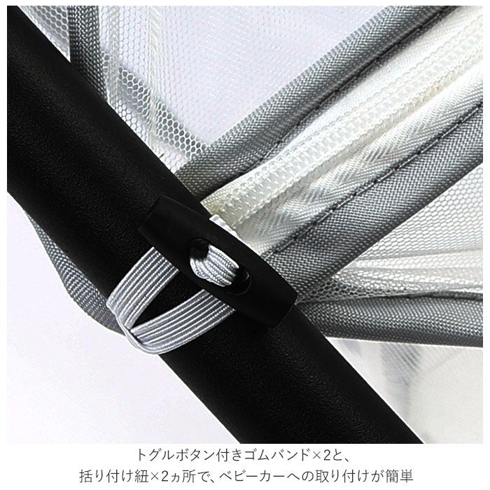 ・トグルボタン付きゴムバンド×2と、括り付け紐×2ヵ所で、ベビーカーへの取り付けが簡単。