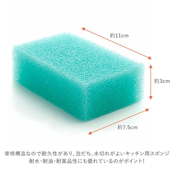 ・「クリーンスポンジ」は、骨格構造なので耐久性があり、泡だち、水切れがよいキッチン用スポンジ。耐水・耐油・耐薬品性にも優れているのがポイント!