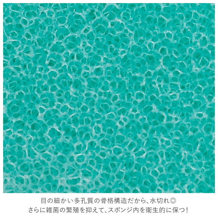 ・水切れがよいのは目の細かい多孔質の骨格構造だから!さらに雑菌の繁殖を抑えて、スポンジ内を衛生的に保つ!