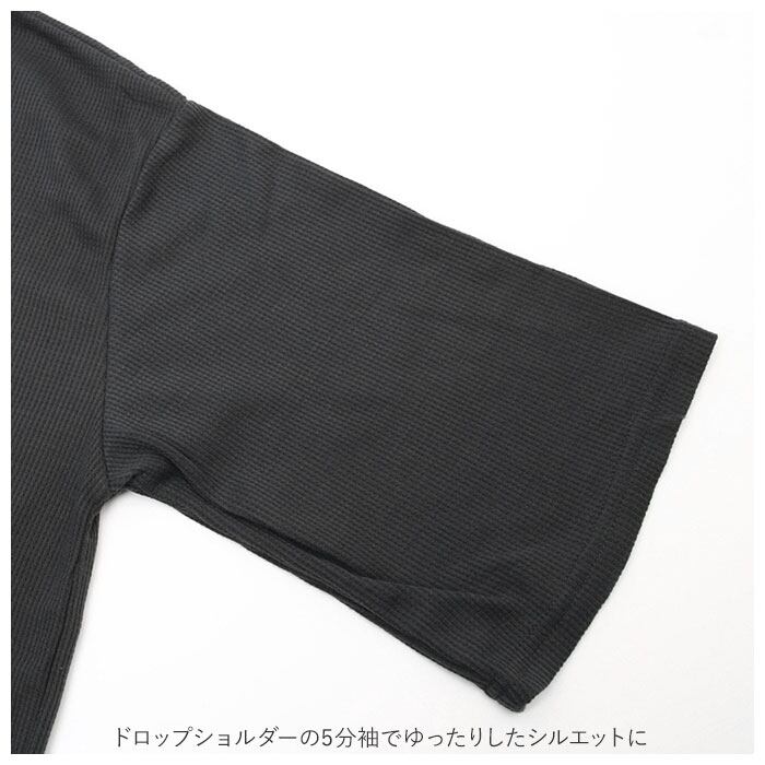 ・肩の力が抜けリラックスした雰囲気を与えるドロップショルダーの5分袖でゆったりしたシルエットに。