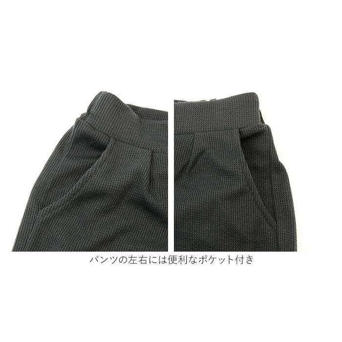・パンツはゆったり幅で締め付け感のないワイドシルエットタイプ。ウエスト部分はゴム仕様だから楽チンな穿き心地。