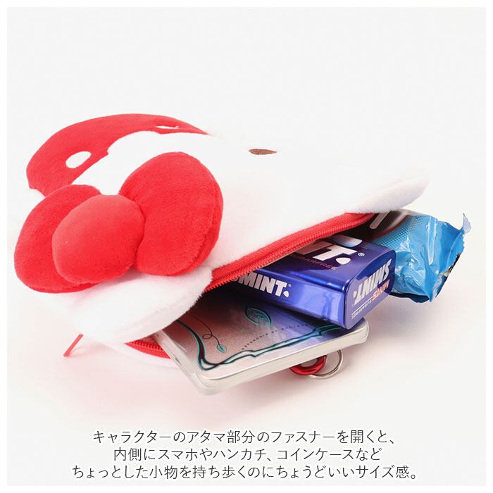 ・キャラクターのアタマ部分のファスナーを開くと、内側にスマホやハンカチ、コインケースなどちょっとした小物を持ち歩くのにちょうどいいサイズ感。(※スマートフォンのサイズによっては収納できない場合もございます。事前にお手持ちの機器のサイズをご確認ください。)