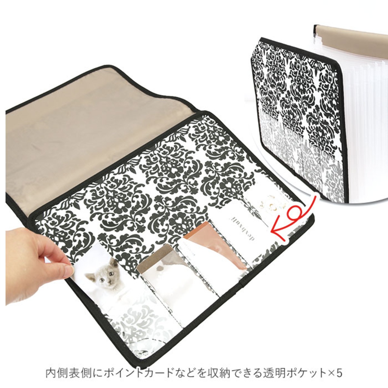 ・内側表側にポイントカードなどを収納できる透明ポケット×5、後ろ側にはレシートなどの一時保管に便利なサイズの違うオープンポケット×2を装備。