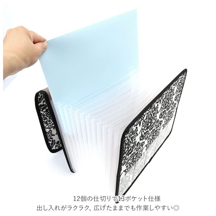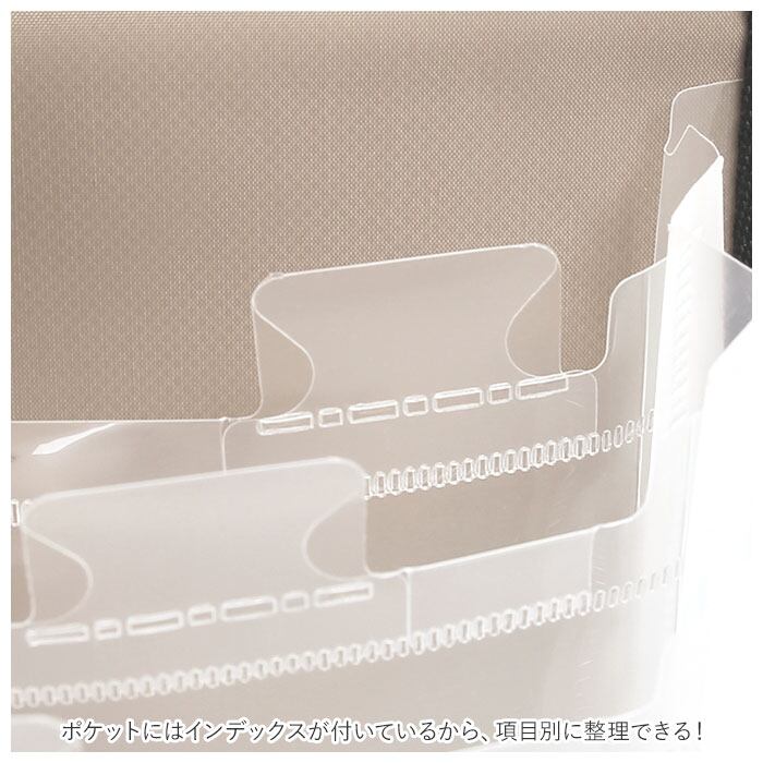 12個の仕切りで13ポケット仕様。ポケットにはインデックスが付いているから、項目別に整理できる!