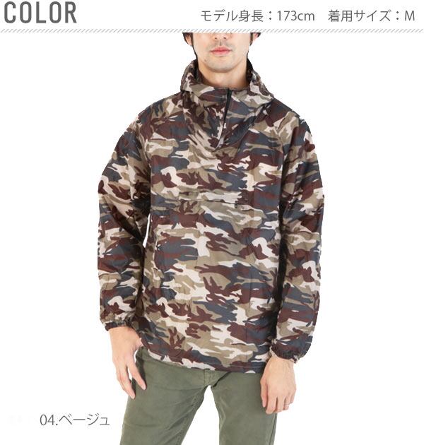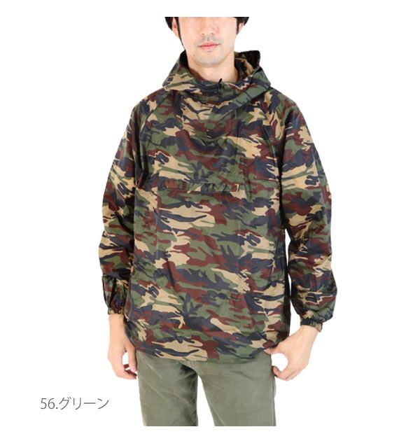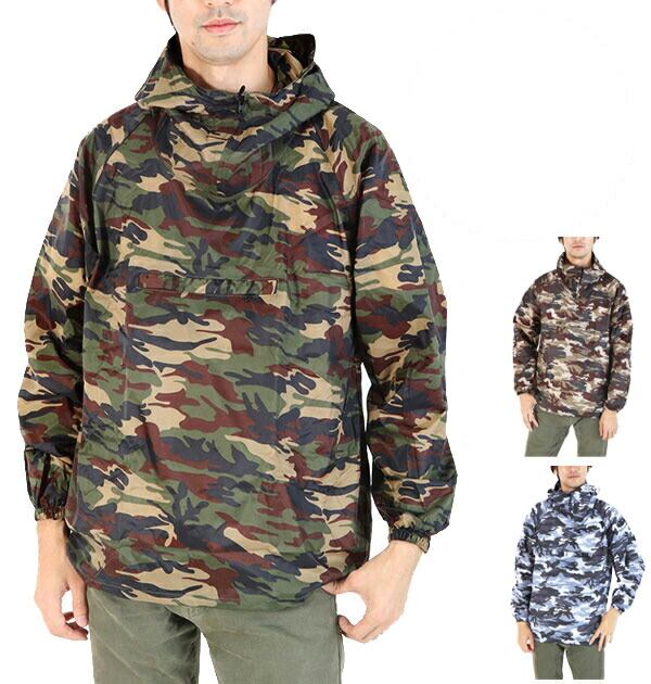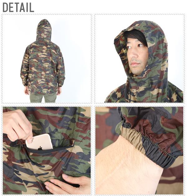 カラーは人気の迷彩を採用し、ポケッタブルに収納可能。頭から被るヤッケデザインです。