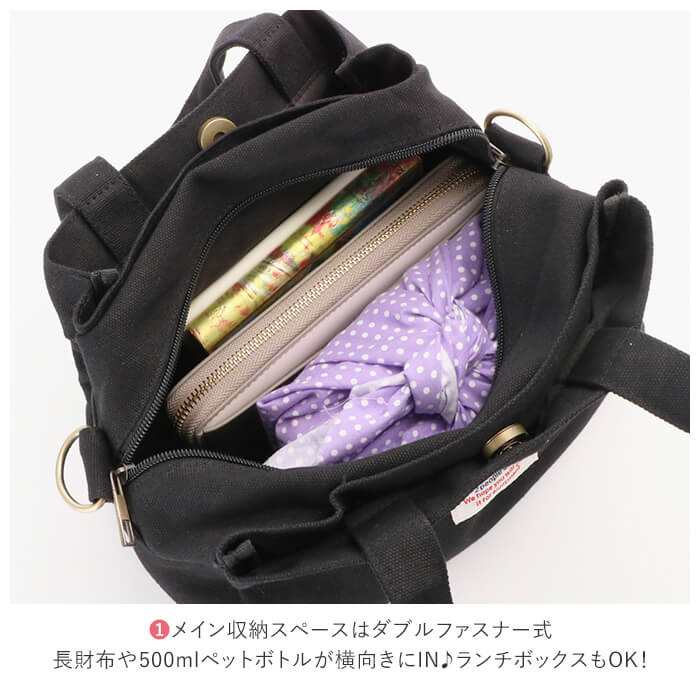 ・メイン収納スペースはダブルファスナー式でマチもたっぷりとられた構造。長財布や500mlペットボトルが横向きに収まるほか、ランチボックスも平置きでしっかり収まるので、ランチバックにも最適!