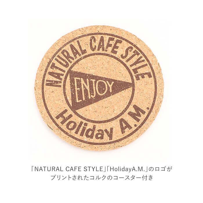 ・「NATURAL CAFE STYLE」「HolidayA.M.」のロゴがプリントされたコルクのコースター付き。