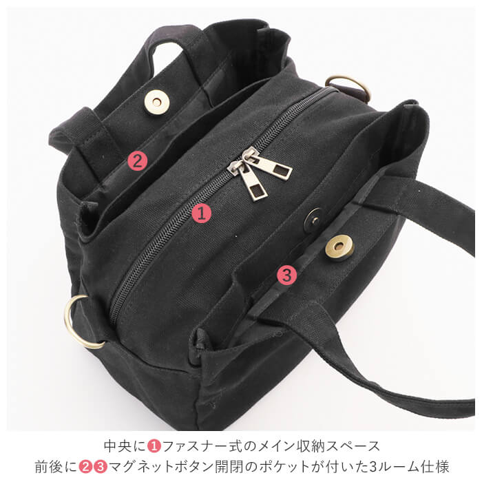 ・中央にファスナー式のメイン収納スペース。前後にマグネットボタンでカンタン開閉するポケットが付いた3ルーム仕様。お財布などの大切な物と、サッと取り出したい小物を分けて収納できるのがポイント!