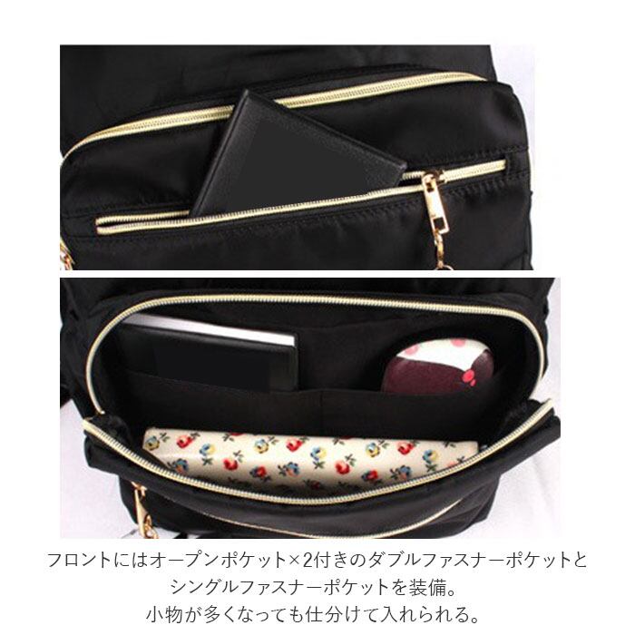 ・さらにフロントにはオープンポケット×2付きのダブルファスナーポケットとシングルファスナーポケットを装備。小物が多くなっても仕分けて入れられる。