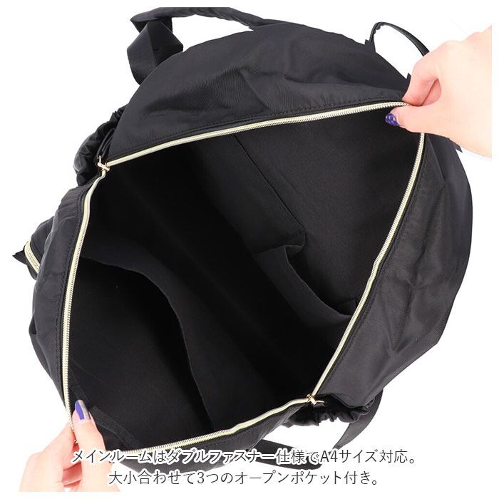 ・メインルームはダブルファスナー仕様でA4サイズ対応。大小合わせて3つのオープンポケット付き。