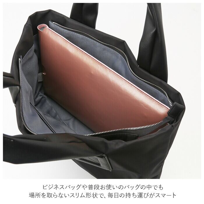 ・ビジネスバッグや普段使いのバッグの中でも場所を取らないスリム形状で、毎日の持ち運びがスマート。