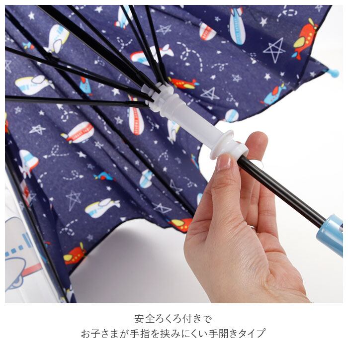 ・お子さまが手指を挟みにくいよう配慮された安全ろくろ付きで、傘生地がスムーズに開閉できる手開きタイプ。