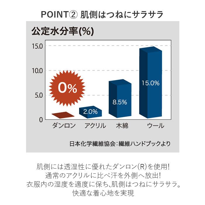 ・通常のアクリルと比較し、衣服内の湿度を適度に保ち快適な着心地を実現。