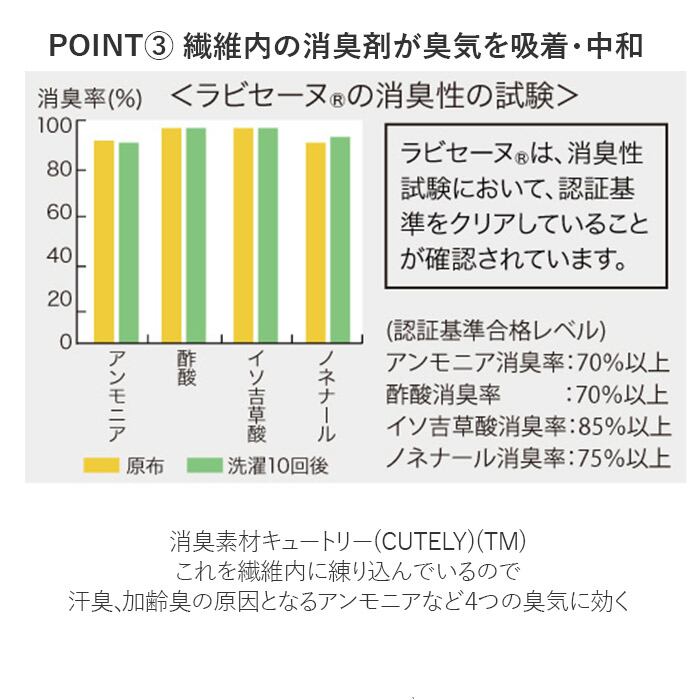 ・汗臭、加齢臭の原因となるアンモニアなど4つの臭気に効く消臭素材キュートリー(CUTELY)(TM)。多孔子質な構造と、繊維中に練りこんだ消臭剤が臭気を吸着・中和。